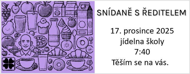 Snídaně s ředitelem je neformální a přátelské setkání nad životem školy. Zveme na něj všechny rodiče ZŠ i MŠ – přijďte si v klidu popovídat, zeptat se na to, co vás zajímá, a společně sdílet, co se ve škole děje a kam směřujeme. Setkání mají vždy stručný rámec (aktuální témata, plánované akce, prostor pro dotazy a podněty). Konkrétní termín a místo vždy předem zveřejňujeme v informačních kanálech školy.